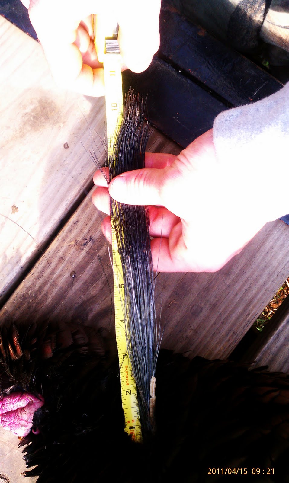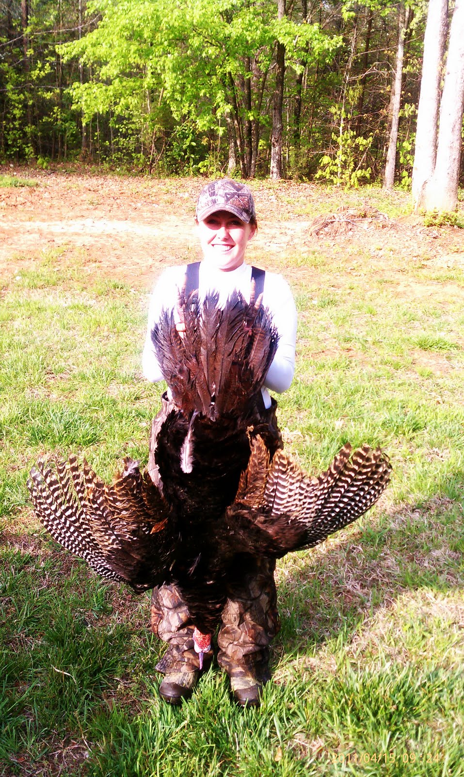 My husband and I went to one location with no luck. Moved on to the next location, got one to gobble back. Set up our decoys, we made our way through the highgrass and proped up against a cedar tree. Turkey moved all the way around us for about 30 min. But I had my gun up and ready the whole time. Muscles cramping, it finally showed its face, walking straight at us. Boom… He fell down into a big ditch.. Thats the story of my first turkey! 10 1/8 in beard, 22.5 lbs, 1 1/4 spurs